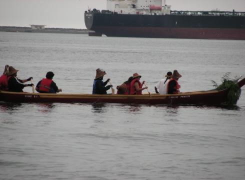 | July 2009 - Port Angeles As our time on the west coast of Vancouver Island came to an end, we needed to go through US Customs before heading down the coast toward San Diego. Since we hadn't bothered to acquire Nexus or I-68 permits, the best choice was to come back up the Strait of Juan de Fuca to Port Angeles. This actually worked well as we wanted to rent a car to allow a Costco run and search for a new winch handle to replace one that "disappeared' from the deck while in Victoria. During our stay, native tribes from Washington and British Columbia were having a big event where canoes are paddled from the reservations to meet up at a location in Puget Sound. A sizable group stopped in Port Angeles on their way from Pillar Point. |